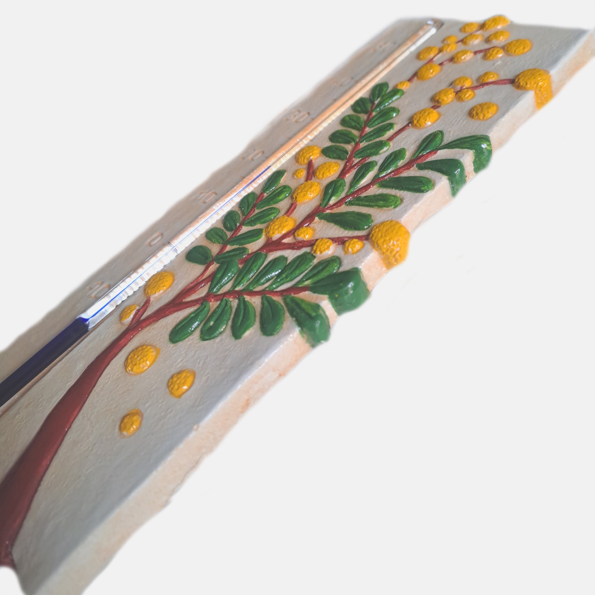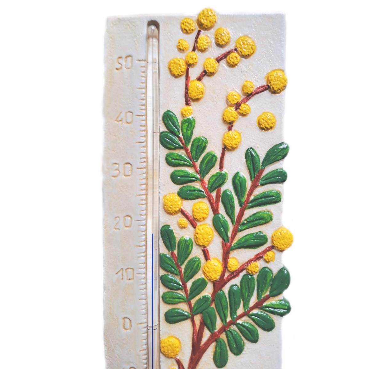 Un thermomètre décoratif avec du mimosa