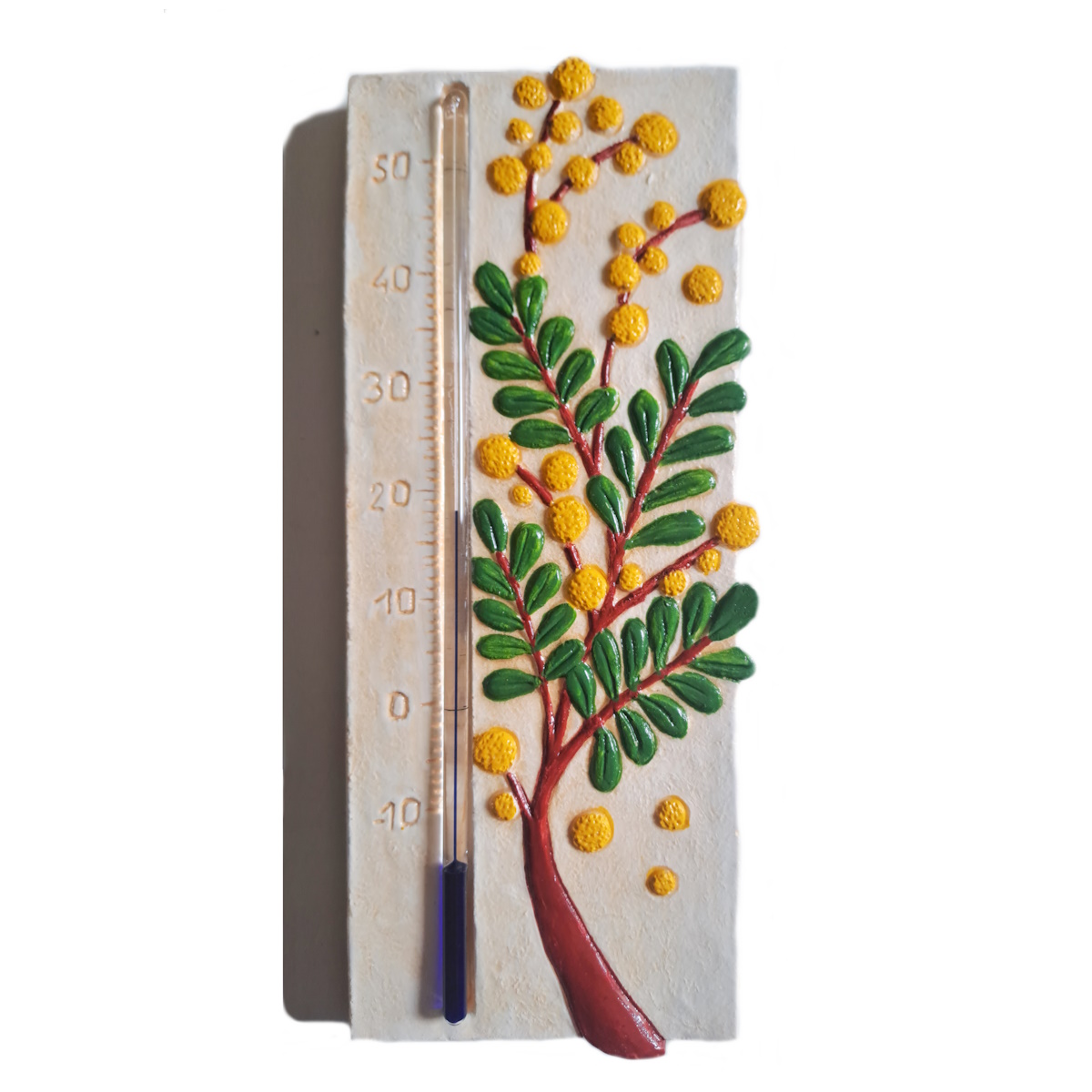 Un thermomètre extérieur mimosa est incontournable pour tous les extérieurs de votre maison, jardin, terrasse, auvent, façade. Mais vous pouvez également l’utiliser dans la maison. En effet, comme les thermomètres présentés sur le site, ils s’adaptent à l’extérieur comme à l’intérieur. C ‘est également le cas de tous les thermomètres géants. En effet, ils marquent de moins 10 ° à 50 ° . Une large amplitude thermique. Ils supportent la pluie et le gel et même l’humidité d’une salle de bains. Le capillaire en verre rond mesure 0,5 cm de diamètre. Sa largeur permet donc une lecture facile degré par degré. Les capillaires sont fabriqués en Allemagne Pour terminer, vous placerez les thermomètres toujours à l’ombre. Vous aurez ainsi les mêmes températures que celles relevées et annoncées dans les stations météo.